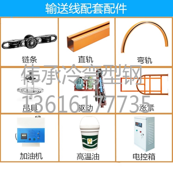 另有配套十字鏈條式輸送軌道的外翻邊軌道型鋼。如果有特殊需求,可做不銹鋼材質或鍍鋅板,厚度及長度也可根據客戶要求定制。